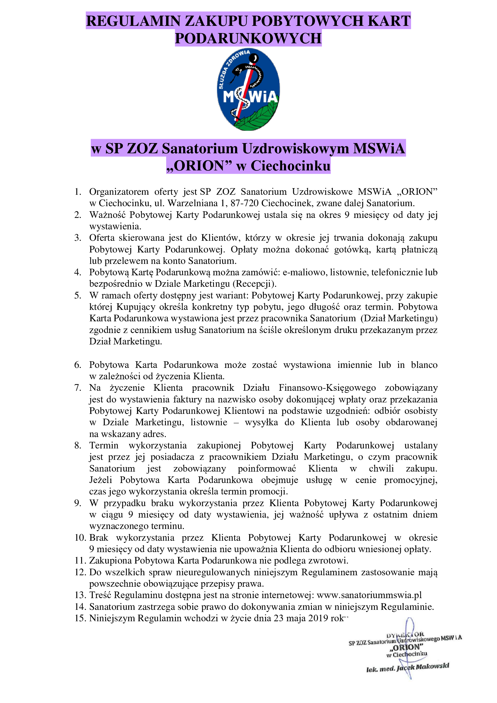 Wychodząc naprzeciw oczekiwaniom naszych Gości udostępniamy Państwu możliwość zakupu Karty podarunkowej o dowolnej wartości, uprawniającej do korzystania z pobytu w naszym sanatorium, można ją zamówić: e-mailowo, listownie, telefonicznie lub bezpośrednio w dziale marketingu lub recepcji.